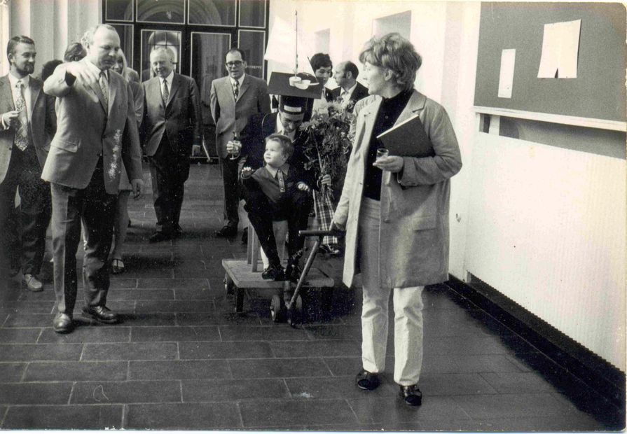 Once a PhD candidate successfully defends his dissertation, the young scholar is dressed up and paraded to the Berlin Rat Haus to give a small speech. Here you see on candidate who obtained his Ph.D. in Giessereikunde, University of Berlin, is paraded. Ms. Manuela Machut is seen pulling the trolley while Herr Steinberg is directing. Photo Taken in 1971.